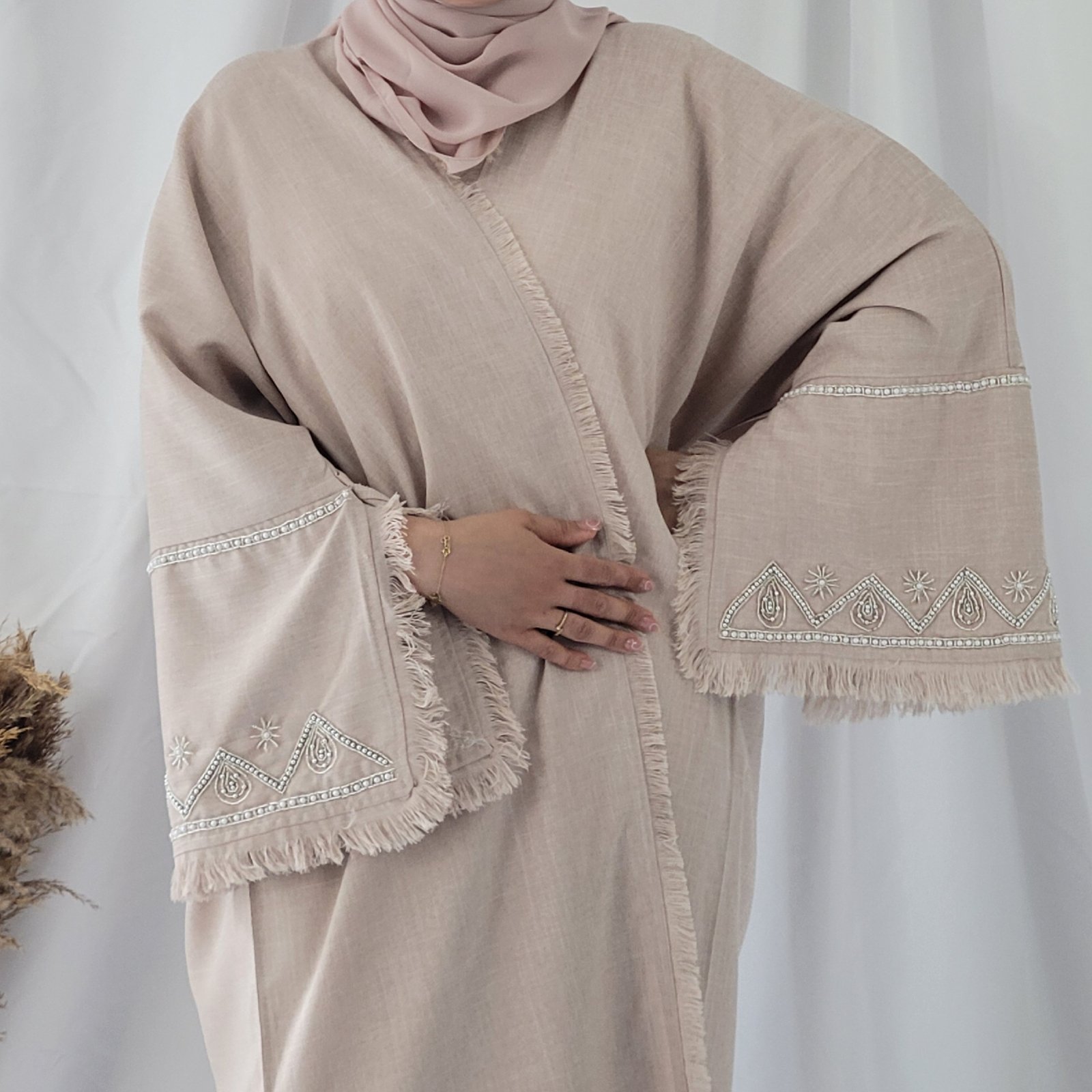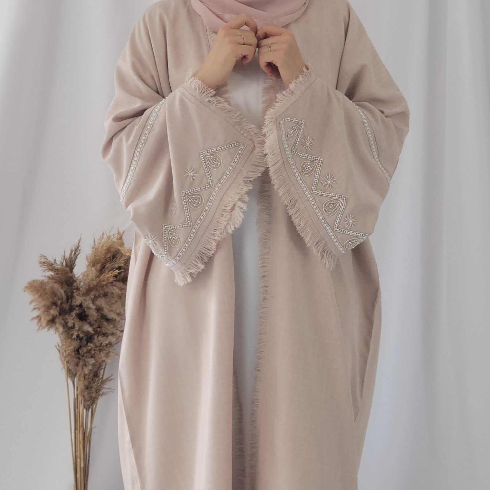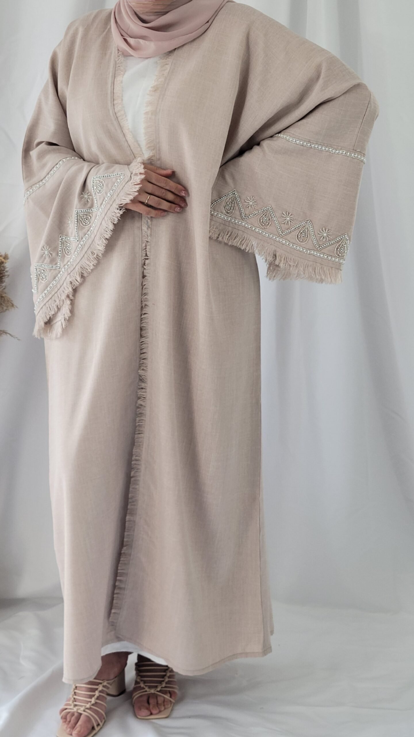 كتشفي أناقة عباية لنن باللون البيج ، تصميم راقٍ يجمع بين الفخامة واللمسة العصرية. مصنوعة يدويًا في دبي بأجود أنواع الأقمشة، لتمنحكِ إطلالة فريدة تعكس الأنوثة والرقي.