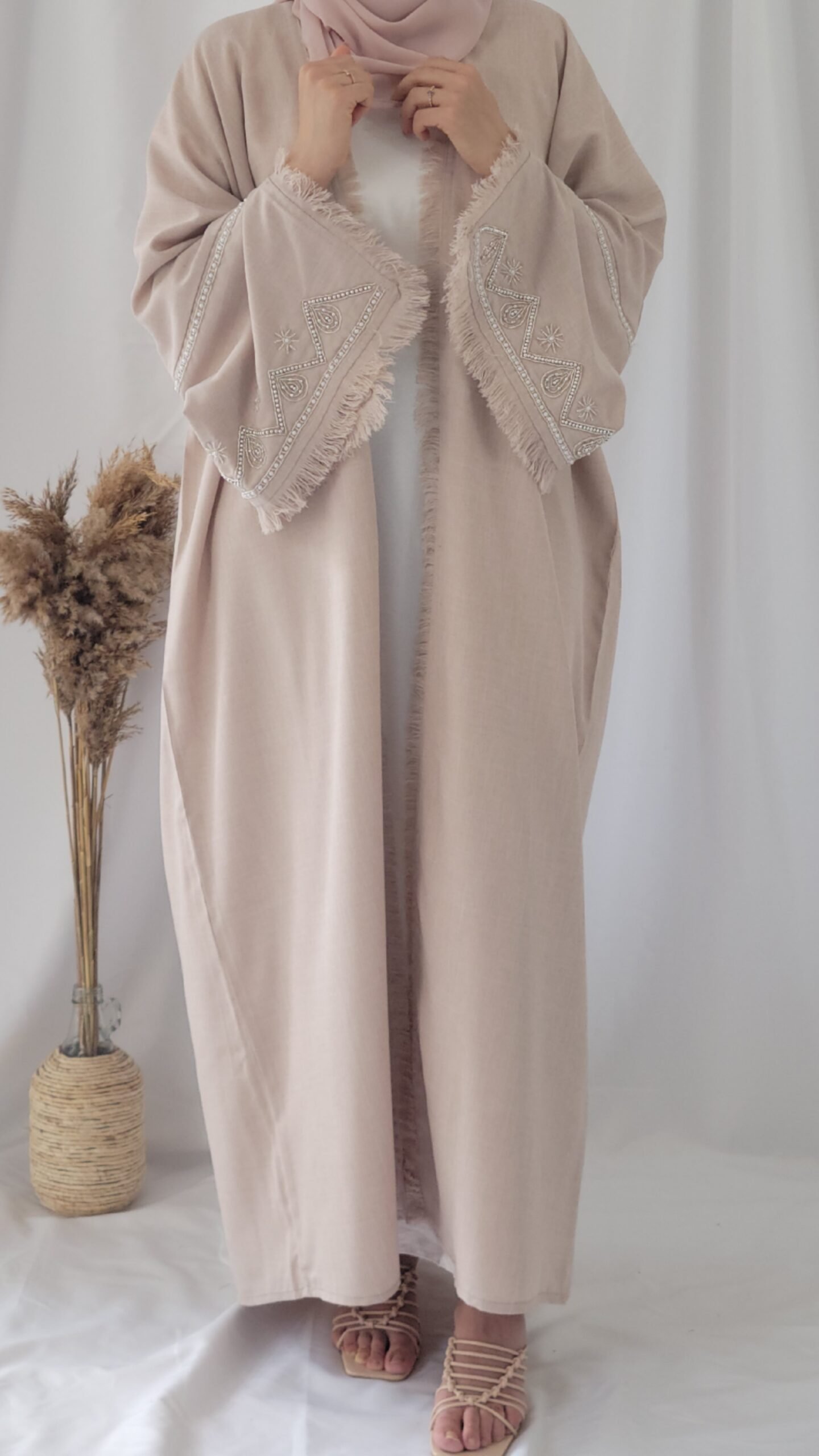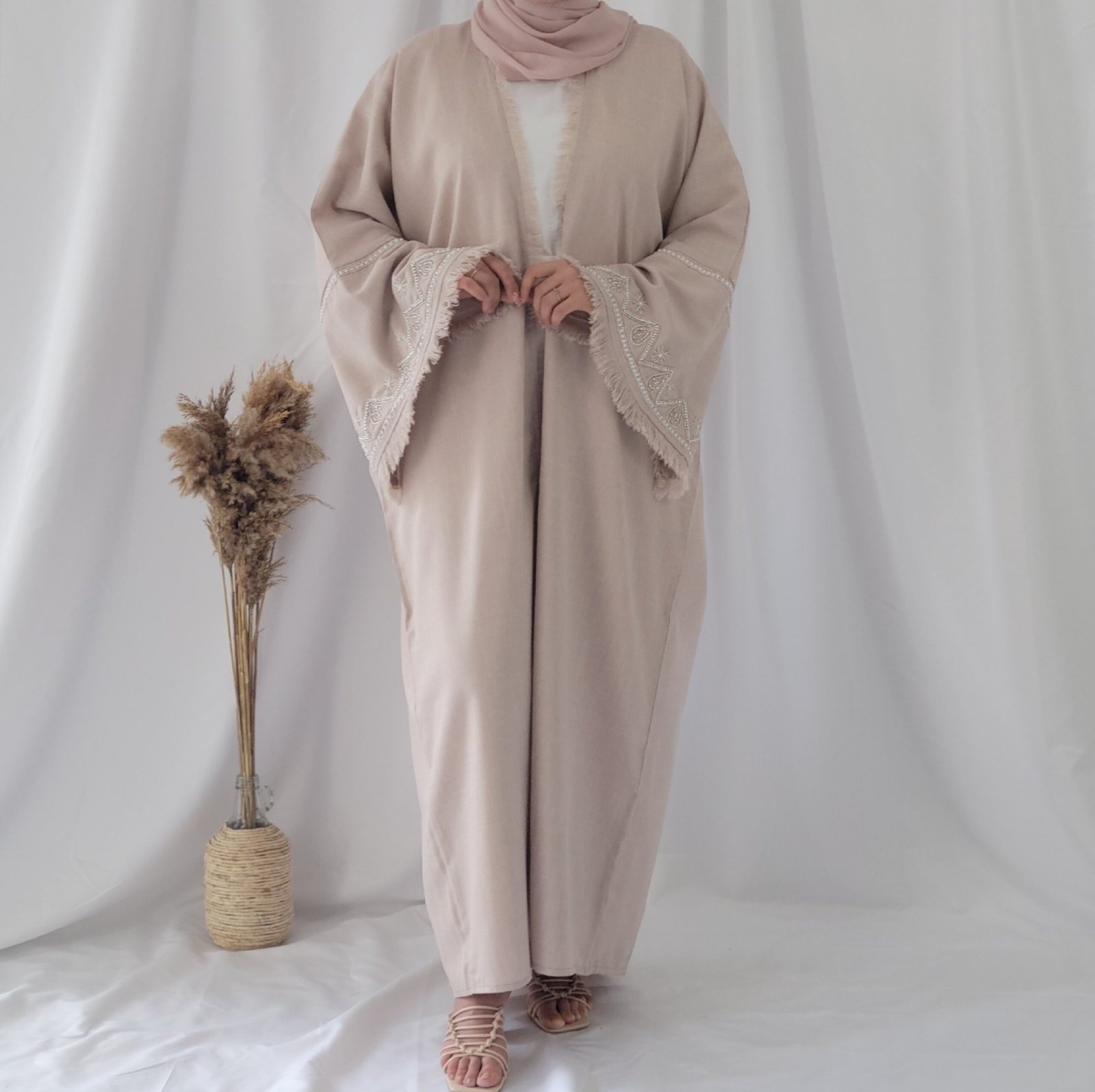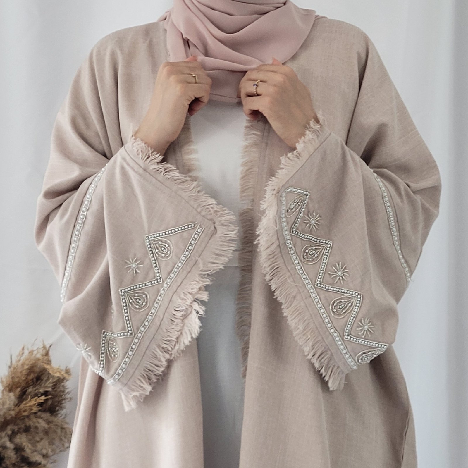 كتشفي أناقة عباية لنن باللون البيج ، تصميم راقٍ يجمع بين الفخامة واللمسة العصرية. مصنوعة يدويًا في دبي بأجود أنواع الأقمشة، لتمنحكِ إطلالة فريدة تعكس الأنوثة والرقي.