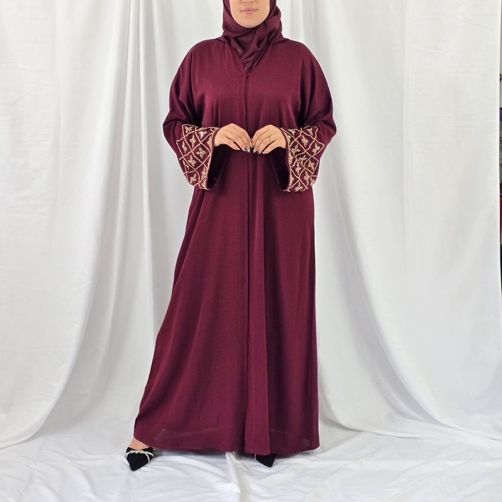 تميّزي بإطلالة فريدة تمزج بين الكلاسيكية الراقية والعصرية الهادئة مع هذه العباية باللون الأحمر البوردو الغني، لون الفخامة والأنوثة.