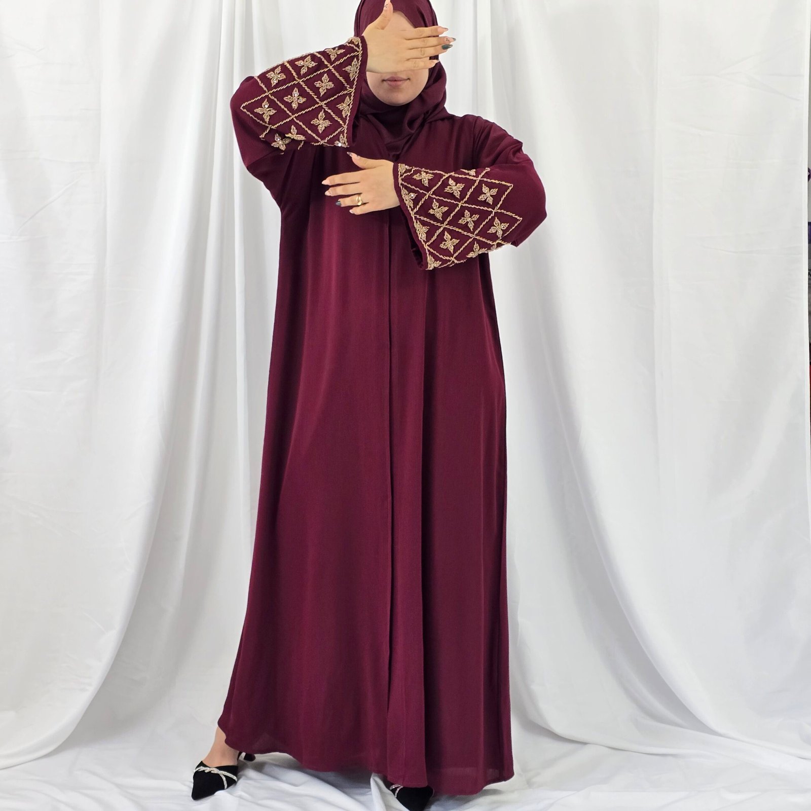 عباية زوم عنابي مطرزة بالذهبي