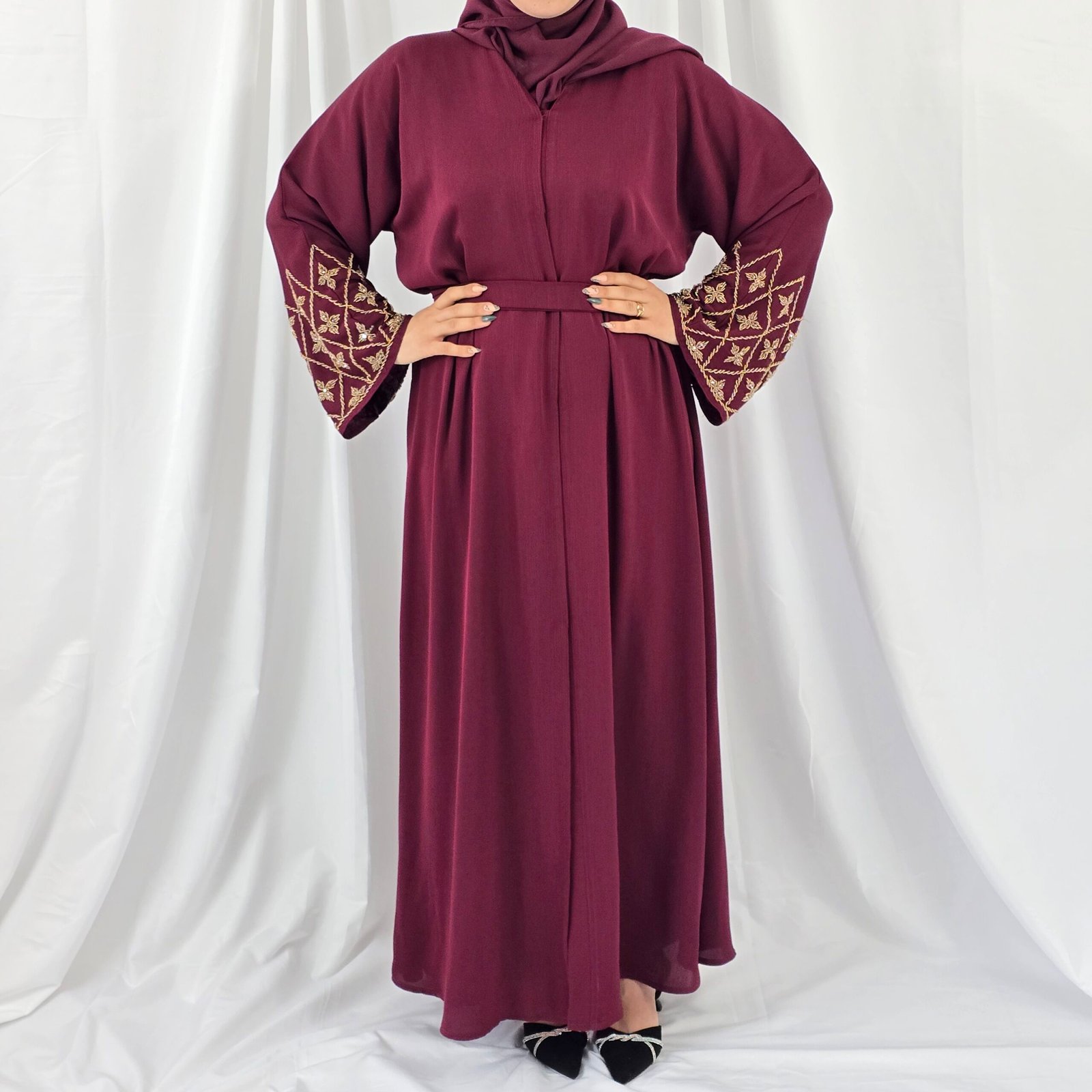 ولمظهر مكتمل، تأتي العباية مع حجاب وحزام بلون متناسق، يضيفان لمسة أنيقة متناغمة، تجعل منها القطعة المثالية لكل مناسباتك: من المناسبات الرسمية، إلى الإطلالات اليومية المتميزة.